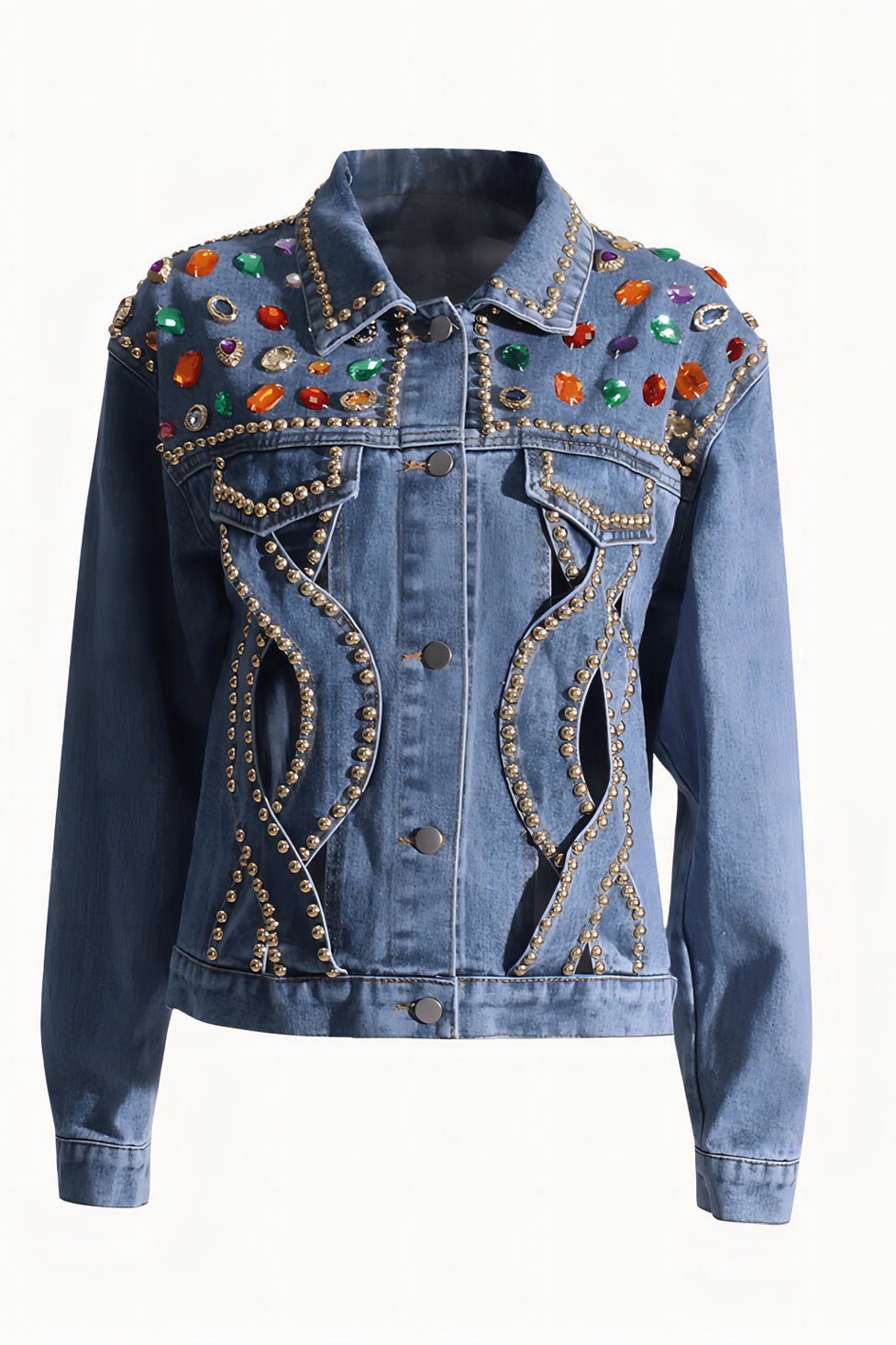 This Abigail Rhinestone Hollow Denim Jacket is sure to make a statement. It has a unique design with intricate rhinestones and hollow patchwork patterns to create a beautiful look. The blue hue adds a modern. eye-catching touch. Perfect for a night out or a special occasion.