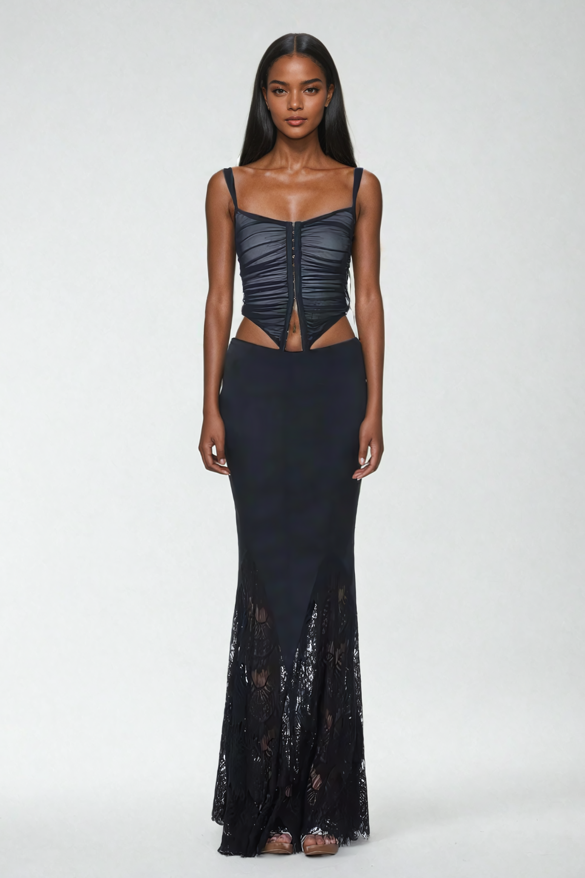 This Ahmoua Ruch Mesh Spaghetti Corset Top is an expertly-designed piece perfect for any formal occasion. The ruched mesh material creates a flattering silhouette while the spaghetti straps add a touch of elegance. Made with high-quality materials. this top is both comfortable and stylish.
