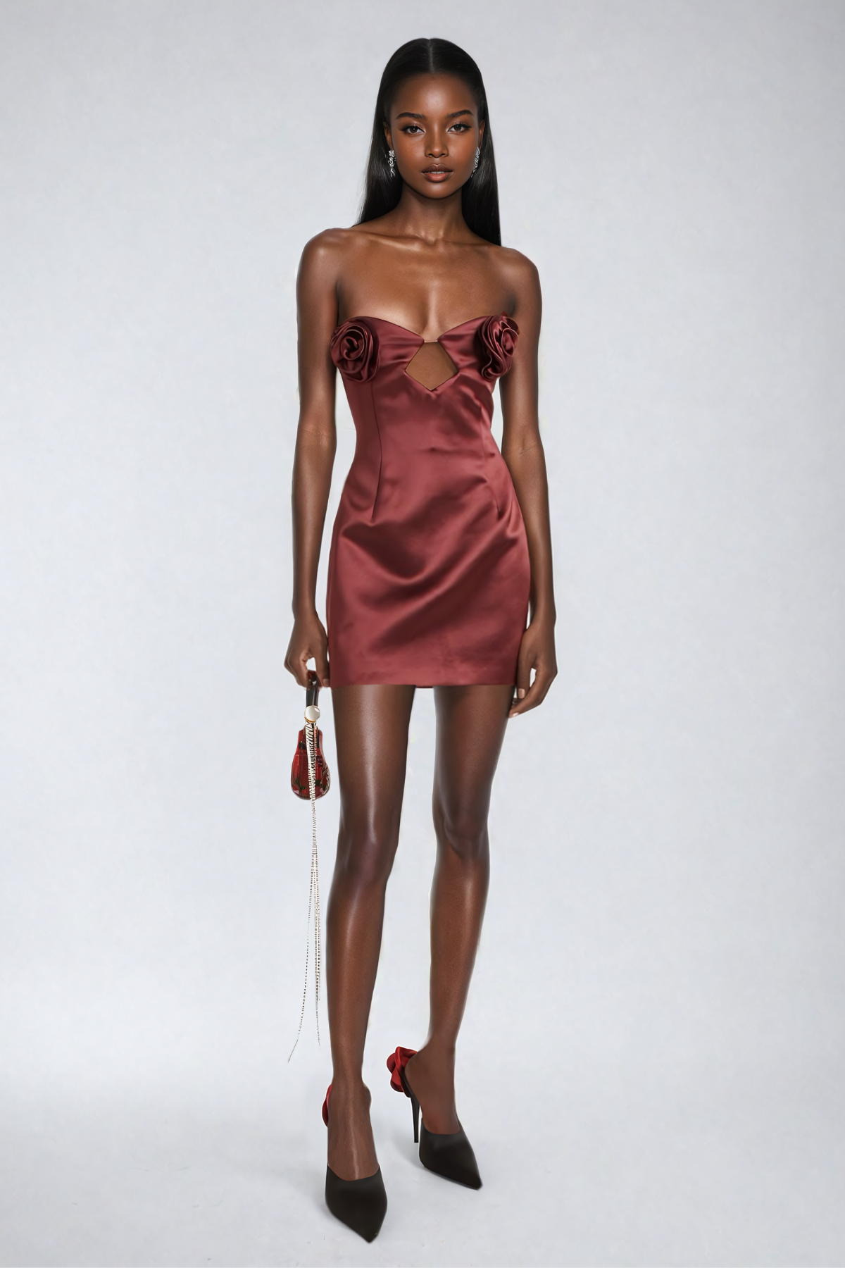 This Alaula Flower Cutout Strapless Satin Mini Dress features a delicate flower cutout design and a strapless satin silhouette. Its elegant and versatile style makes it perfect for special occasions or a night out. The dress offers a flattering fit and high-quality fabric. ensuring comfort and durability.