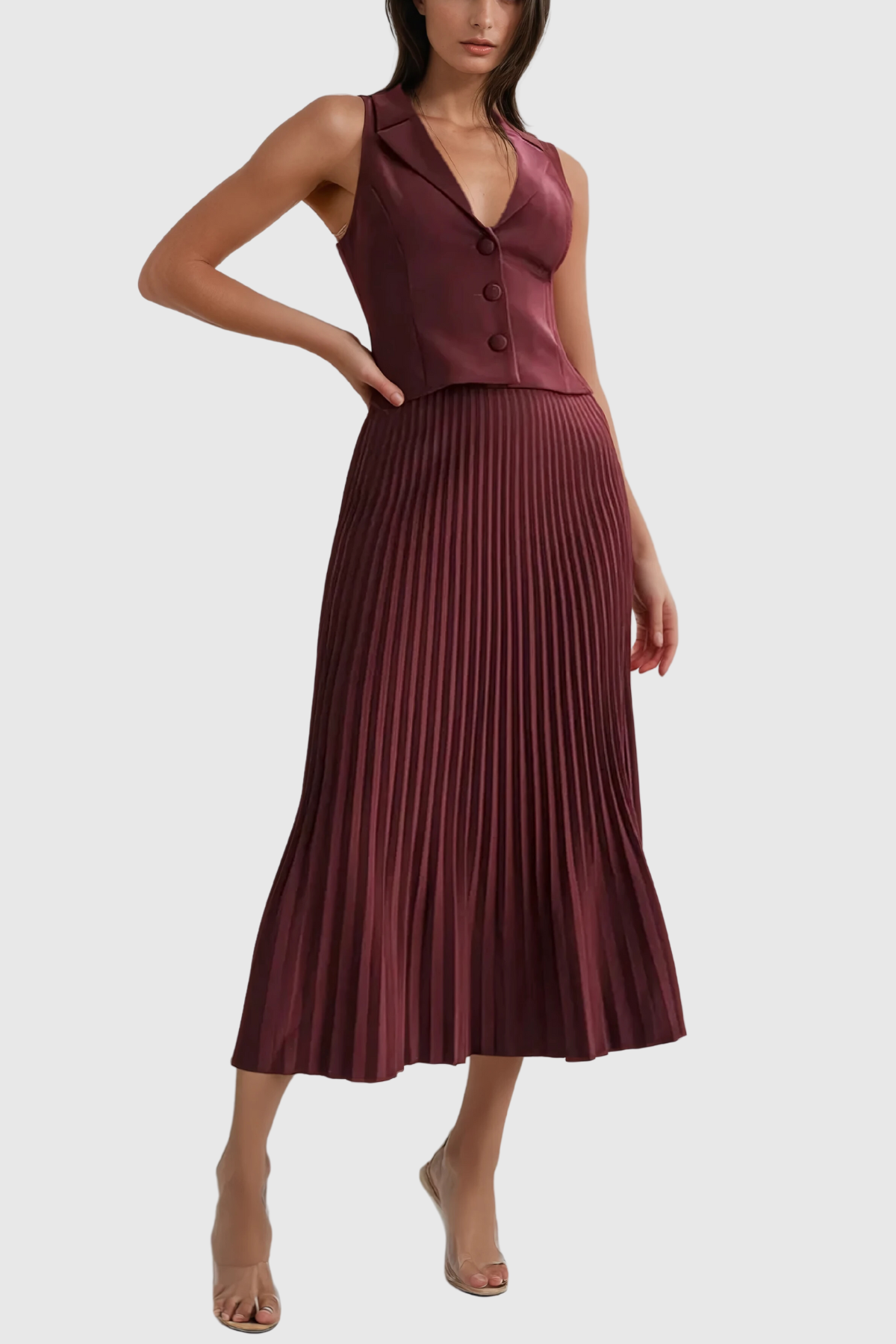 Upgrade your work wardrobe with the Alora Sleeveless Lapel Ruch Skirt Set in Red. This set boasts a chic sleeveless lapel top paired with a flattering ruched skirt. perfect for creating a sleek and professional look. Made with high-quality fabric. this set offers comfort and style for all-day wear.