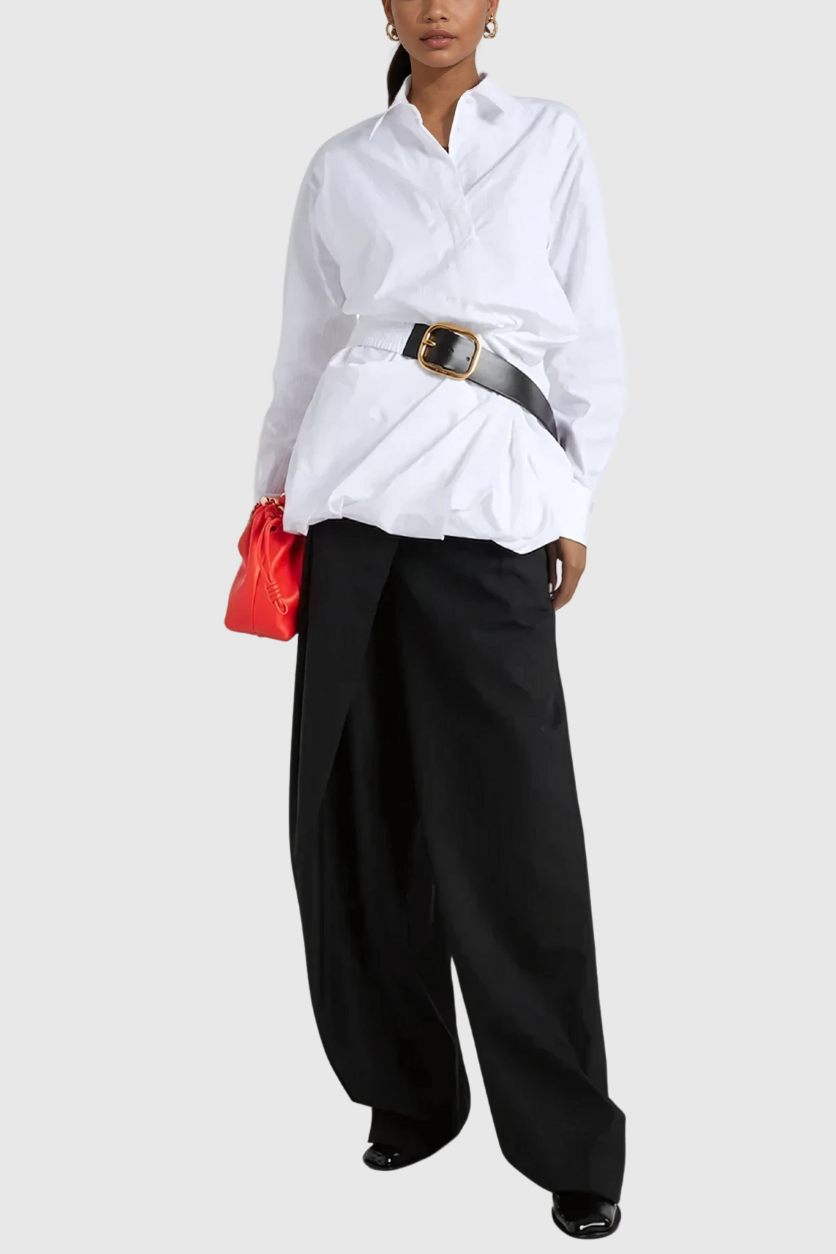 Crafted from soft and lightweight fabric. the Altilde Ruch Buckle Shirt combines comfort and style in one. The ruched design and buckle detailing add a touch of elegance to this classic white shirt. Perfect for a professional look or a casual outing.