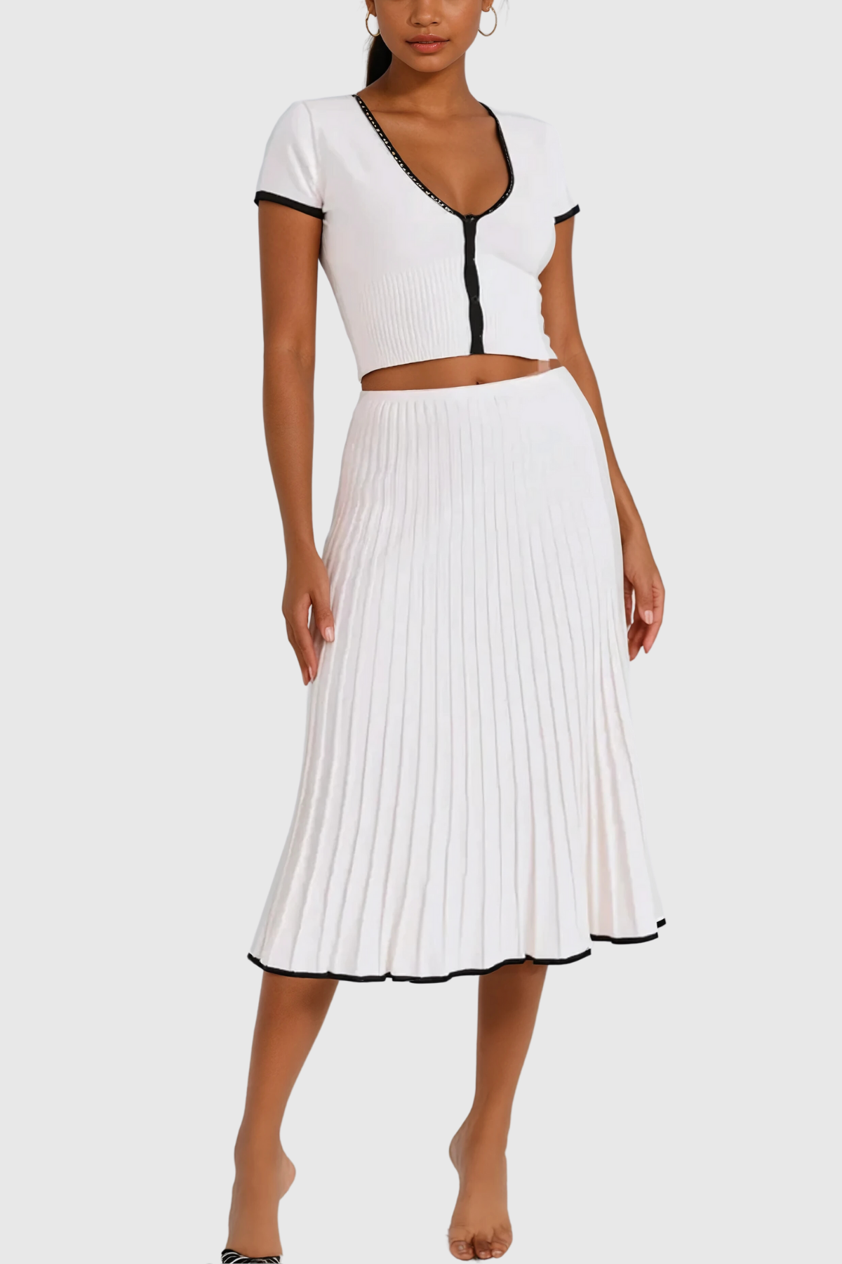 Elevate your style with the Alvar Plunge Ruffle Knit Skirt Set. The deep v-neckline and ruffle details create a sophisticated look. while the high-quality knit fabric ensures comfort and durability. Perfect for any occasion. this set effortlessly combines fashion and function.