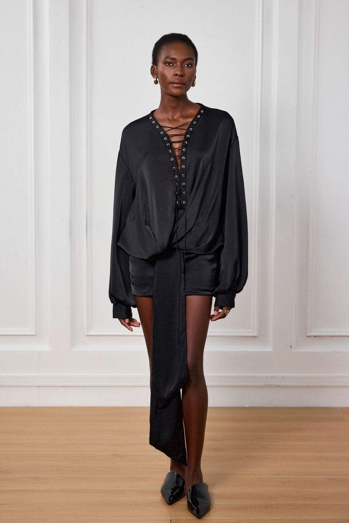 The Amaris Lace Up Satin Fringe Mini Dress is a must-have for any fashion-forward individual. With its elegant lace up design and luxurious satin material. it exudes sophistication and glamour. The fringe detail adds a touch of playful movement to the dress. making it perfect for any special occasion. Elevate your style game with this unique and chic dress.