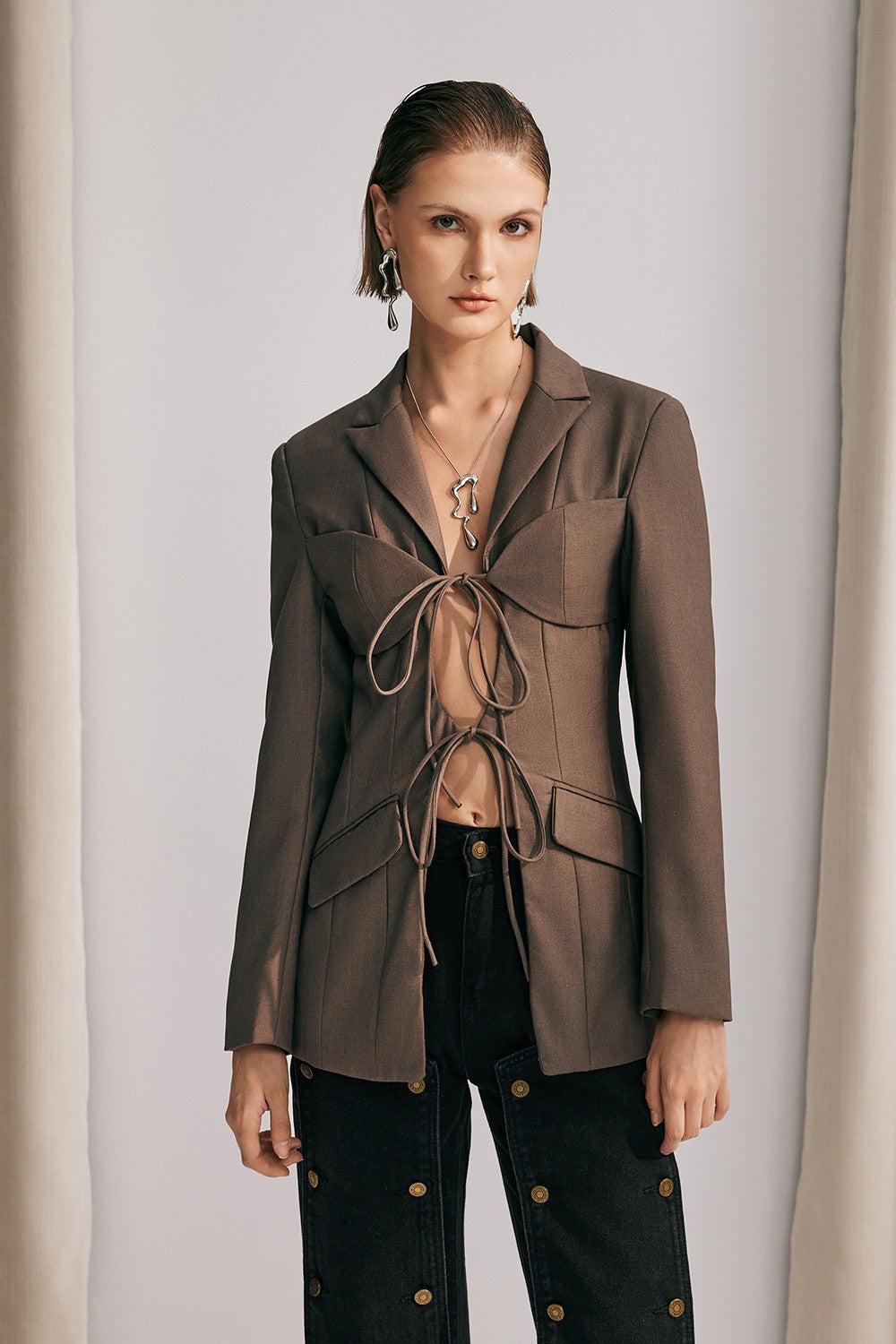 The Arlette Lace Up Cutout Jacket is a versatile and stylish addition to any wardrobe. Available in black. grey. or brown. this jacket features trendy cutouts and a lace up front. Perfect for any occasion. this jacket is a must-have for any fashion-forward individual.