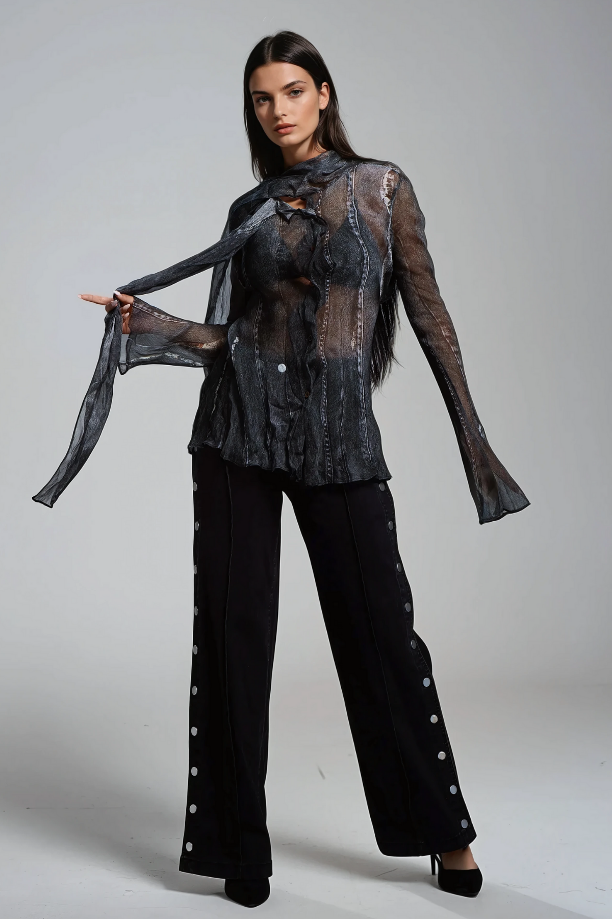 Expertly crafted with a ruched design and asymmetrical silhouette. the Baldassare Fringe top adds texture and dimension to any outfit. Perfect for elevating your wardrobe. this top combines style and versatility for a unique and polished look.