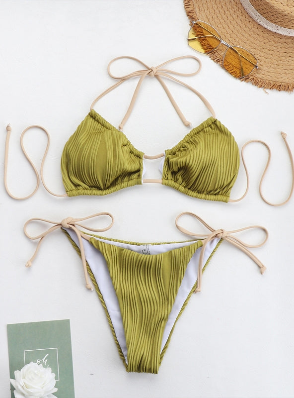 Stroll along the sandy shores with the White Triangle Bikini Top from Lilacoo. This ultra-cute and comfortable bikini top boasts scrunch fabrication with added stretch. triangle cups. a v-neckline. adjustable straps. and an adjustable back tie closure. The buttom. also showcases a scrunch fabrication with added stretch. a low-rise fit. adjustable tie sides. and cheeky seat coverage. This ultra-cute and comfy bikini bottom is perfect for completing your beach look.