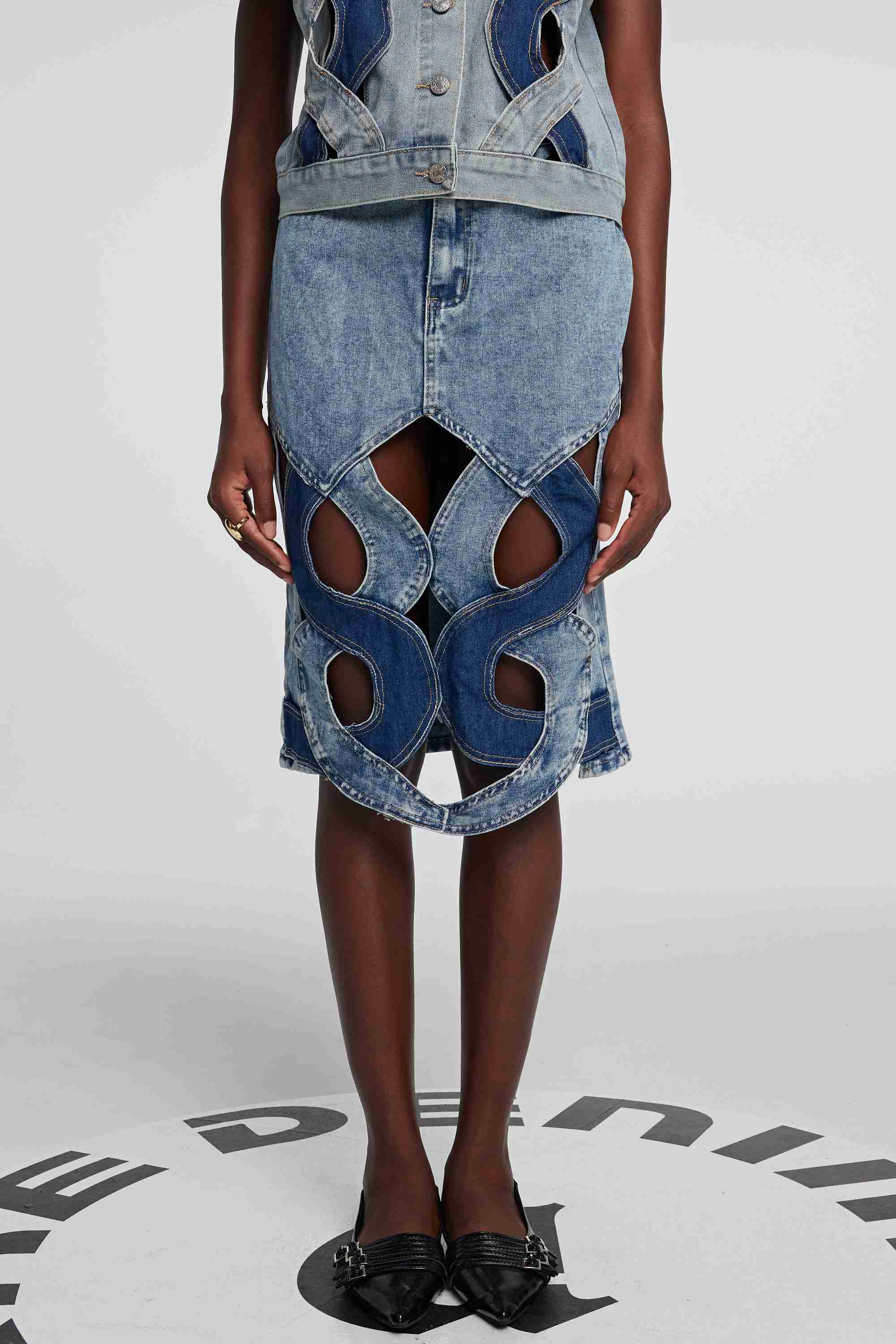 This Madison Cutout Denim Skirt has been crafted with 100% pure denim for a long-lasting comfortable fit. It features distressed detailing and a stylish cutout design that makes it a great addition to your wardrobe. Perfect for casual days or dressy occasions.