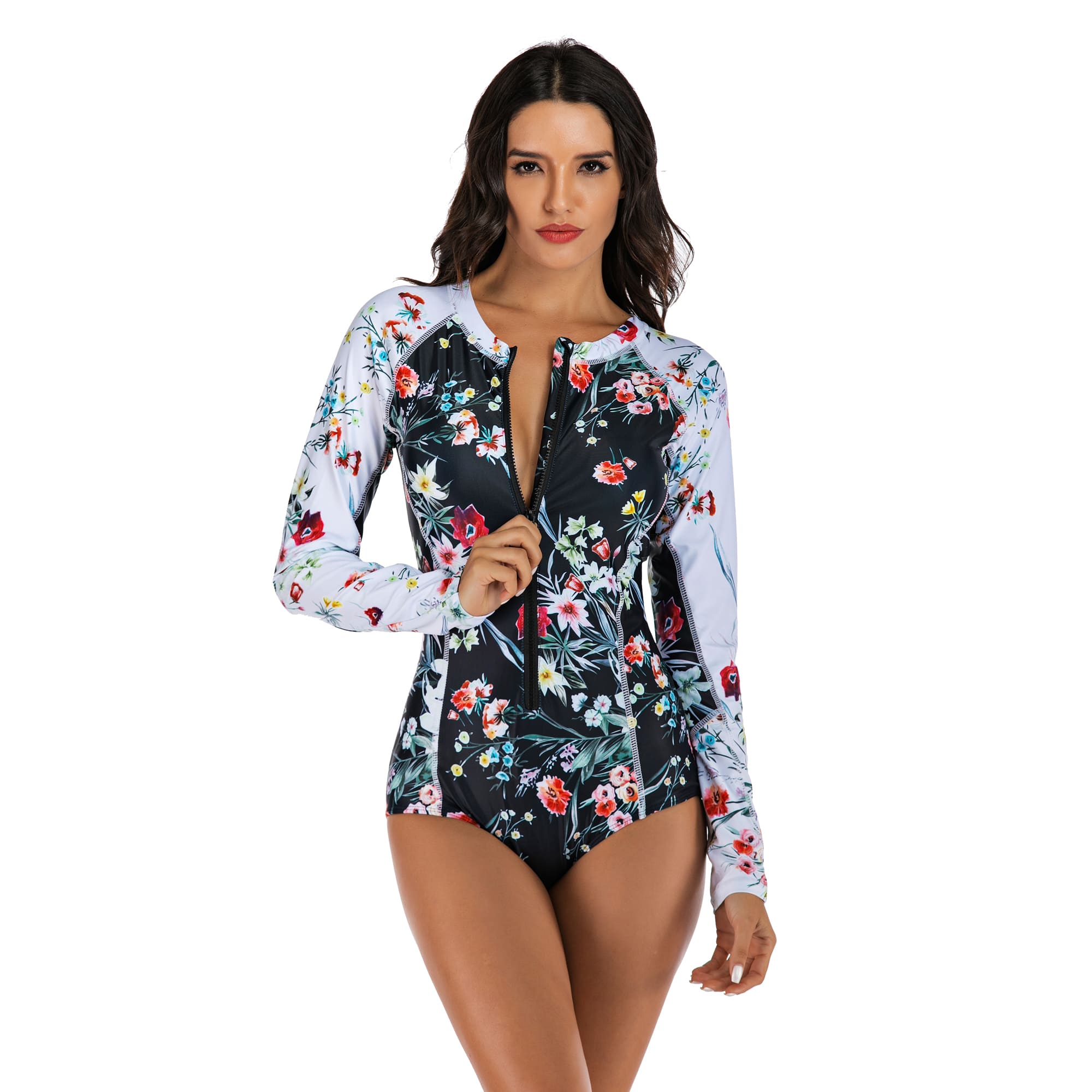 One Piece Floral Swimsuit Long Sleeve Bathing Suit for Women