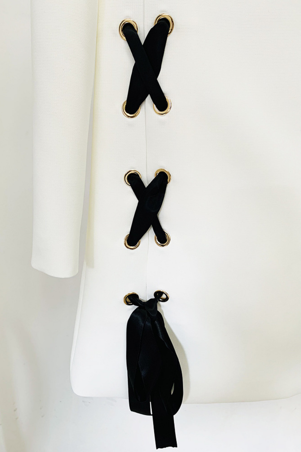 Introducing the Shiloh Lace Up Ribbon Mini Dress - a chic and versatile addition to your wardrobe. Crafted from high-quality materials. this dress features a unique lace-up detail and ribbon ties for a customizable fit. Its mini length and classic design make it perfect for any occasion.