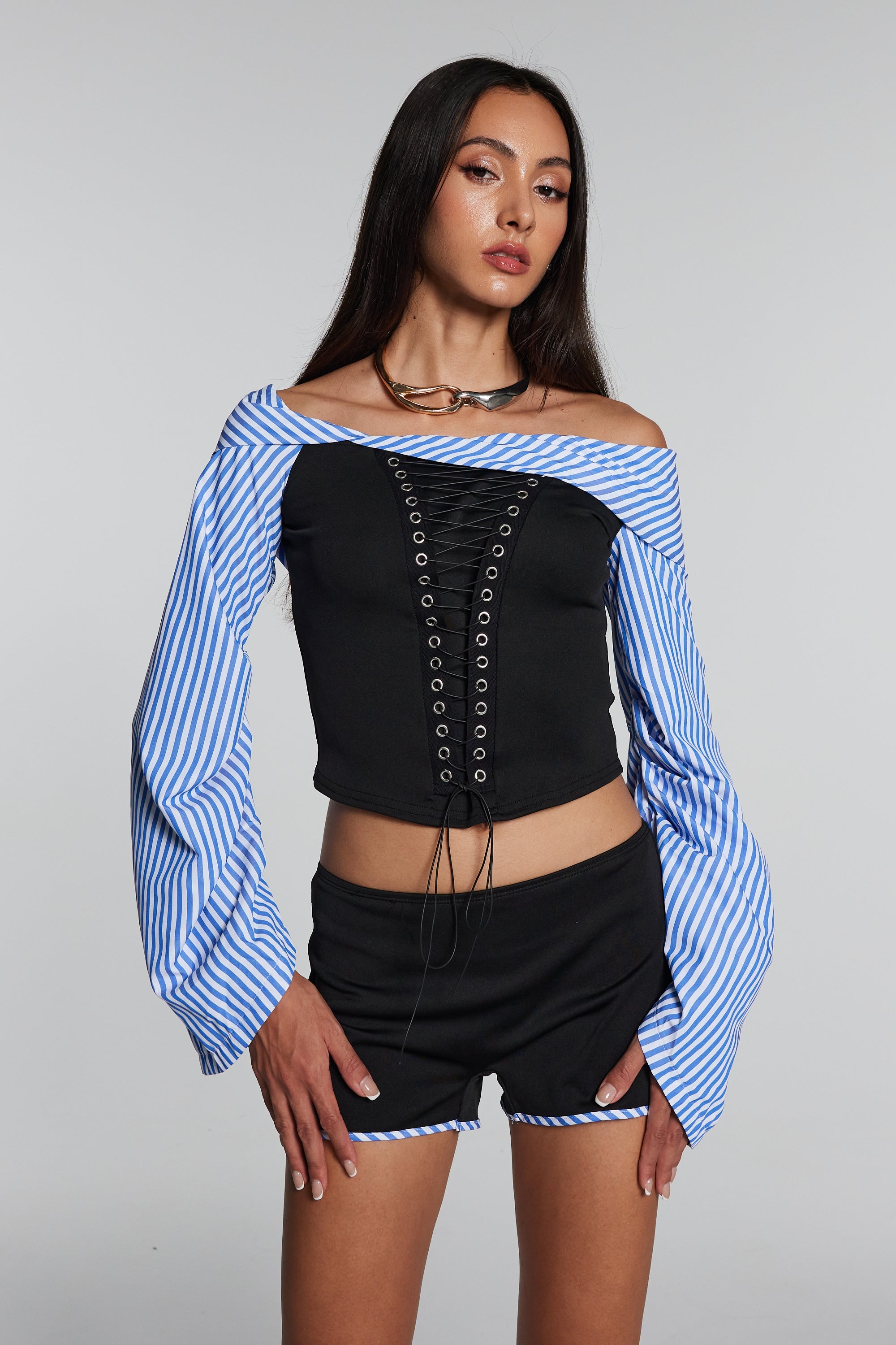 Stay stylish with our Skyla Stripe Lace Up Off Shoulder Set. The lace-up detailing adds a touch of elegance while the off-shoulder design keeps you fashionable. Made with soft and breathable fabric. this set is perfect for any occasion. Elevate your wardrobe with this must-have set.