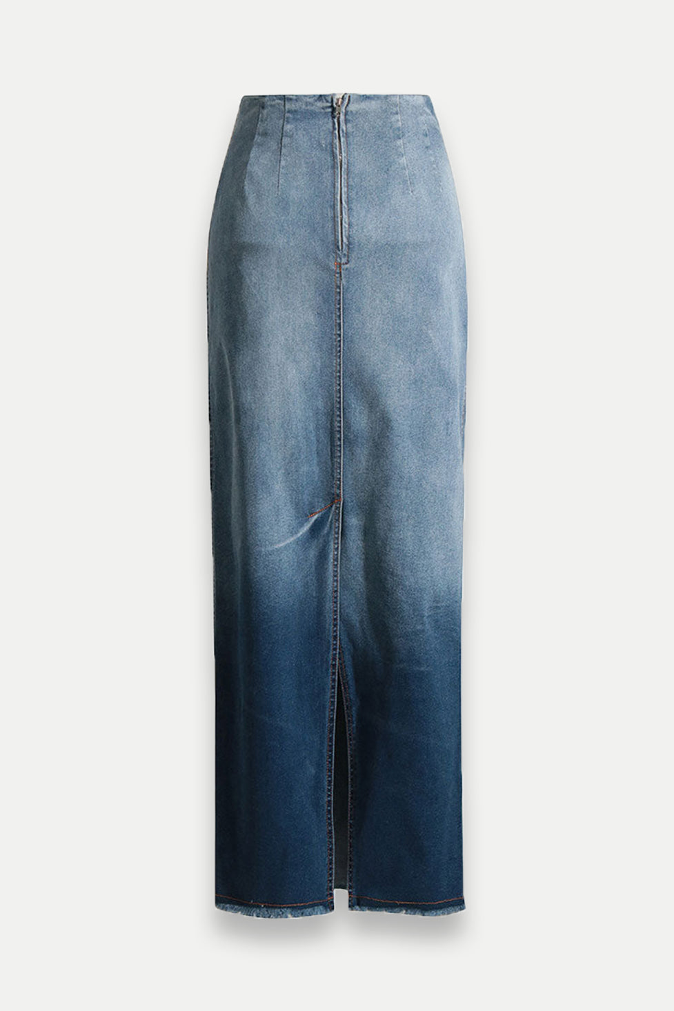 The Sofia High Waist Maxi Denim Skirt combines style and comfort. Featuring a high waist. this durable denim skirt offers a flattering fit and timeless design. You can feel confident wearing it anywhere!