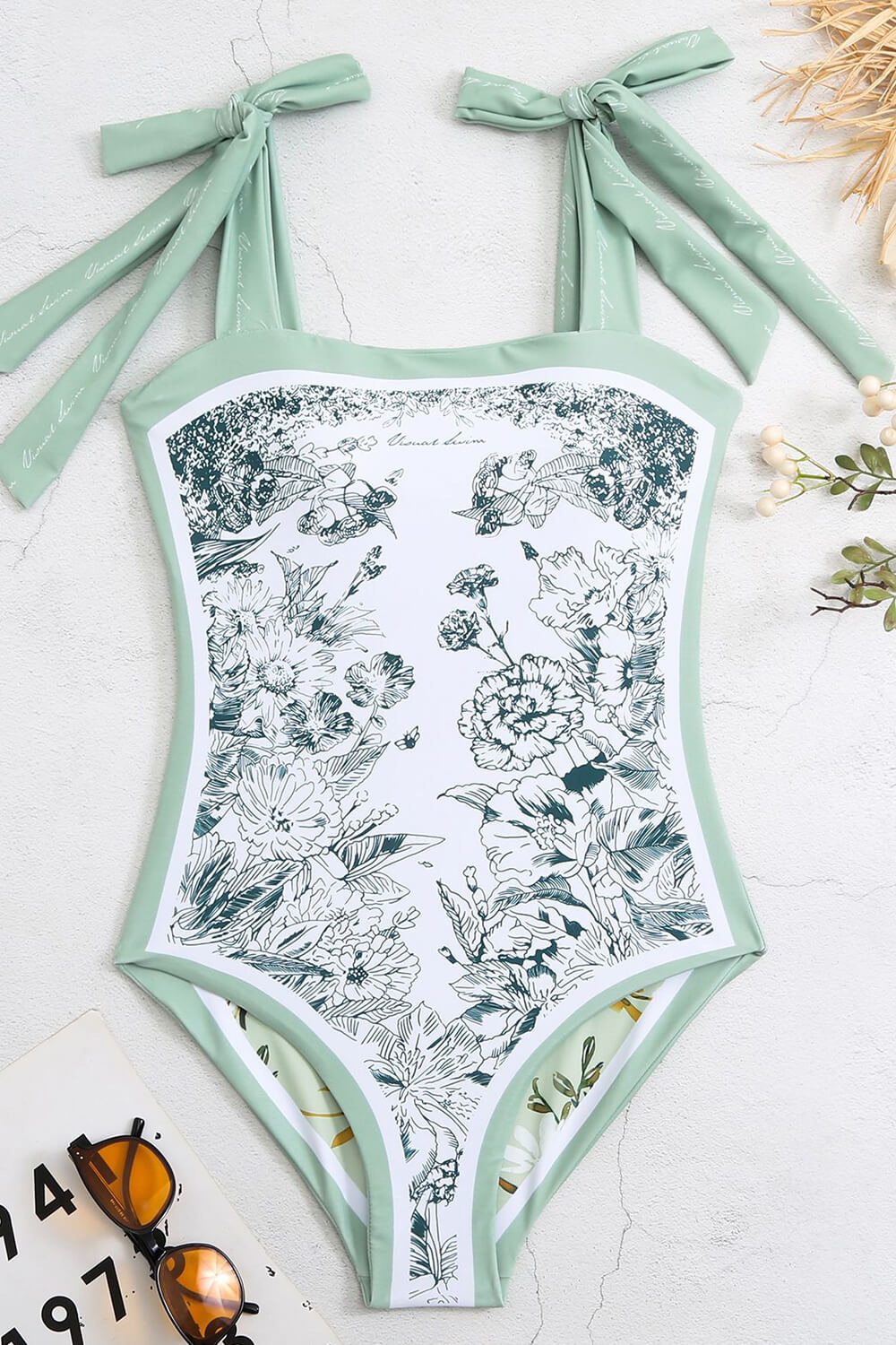 Spring Green Floral Print Reversible Tie-Shoulder One Piece Swimsuit