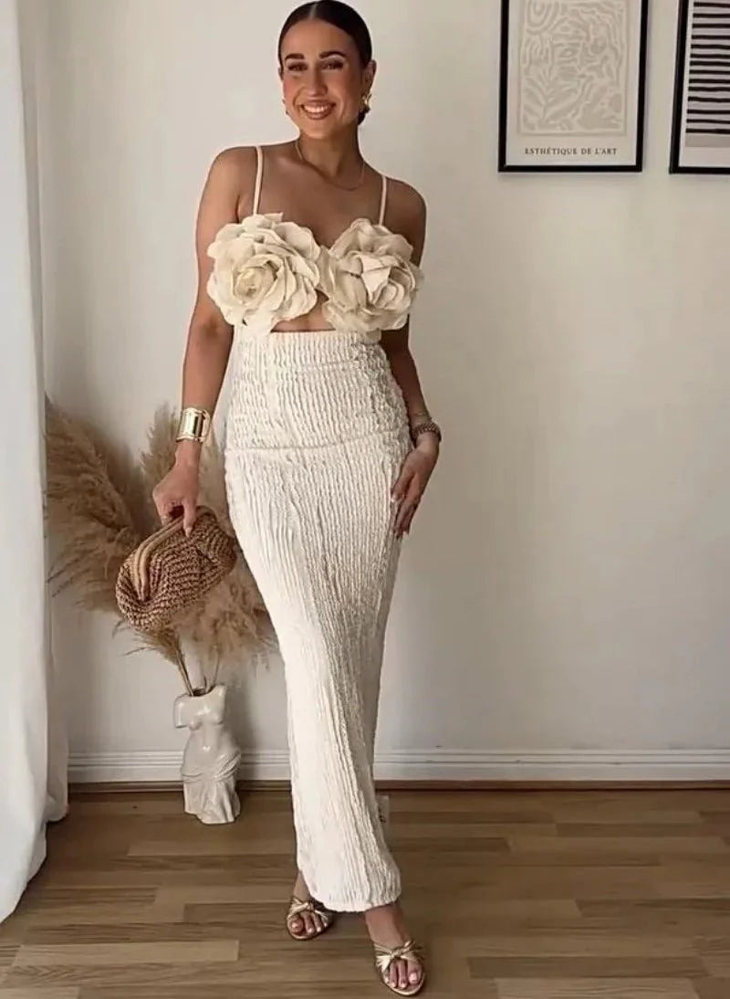 Design: Eye-catching ankle-length sheath dress featuring a stylish flower applique bodice. deep V-neckline. and elegant backless design with spaghetti straps.