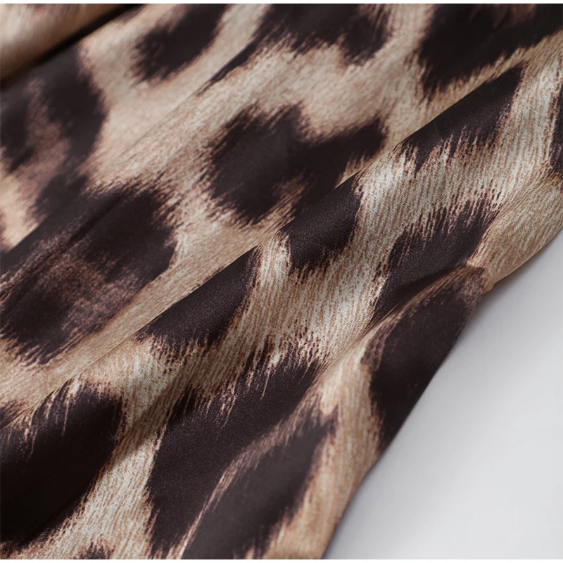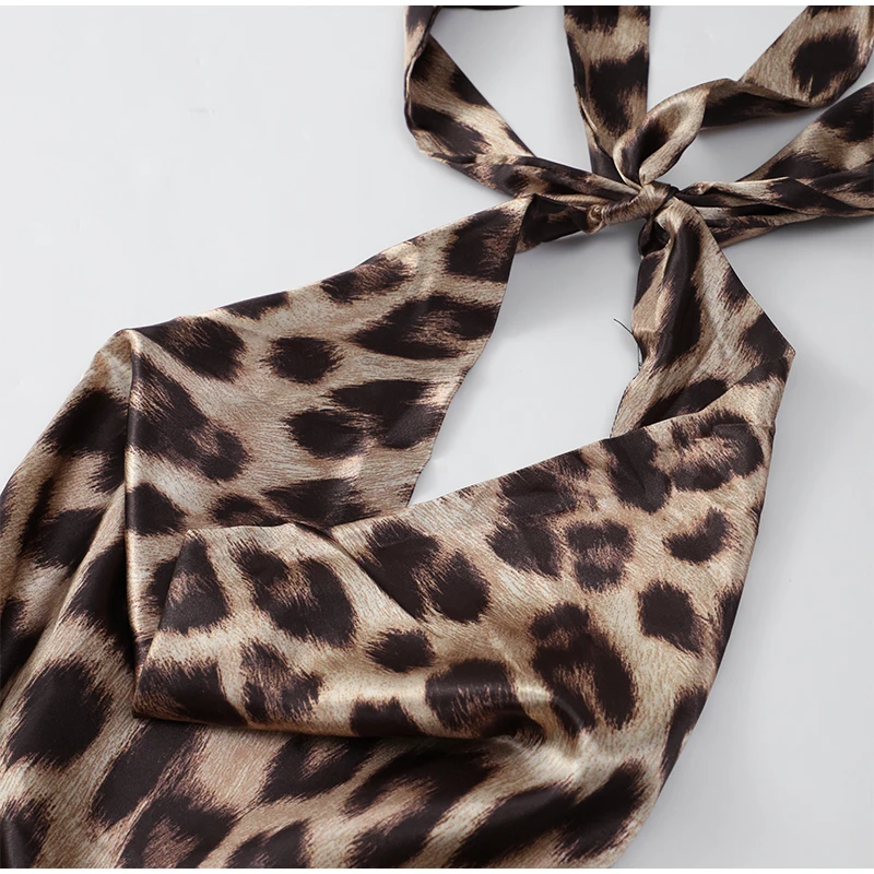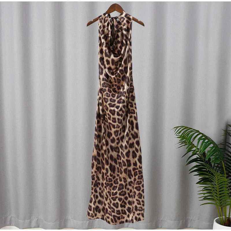 The dress features a striking leopard print pattern that exudes confidence and timeless style. complemented by a flattering V-neck and eye-catching halter design. Its backless silhouette adds a touch of allure. while the straight cut ensures a sleek and elegant profile. The empire waistline creates a refined shape that flatters various body types.