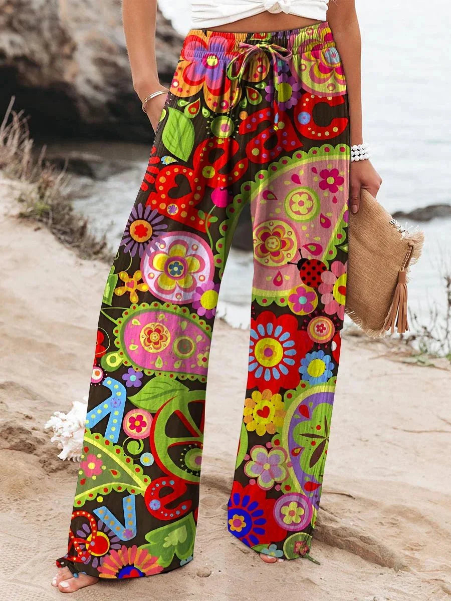 Women's Retro Hippie Paisley Peace Floral Art Printed Casual Pants