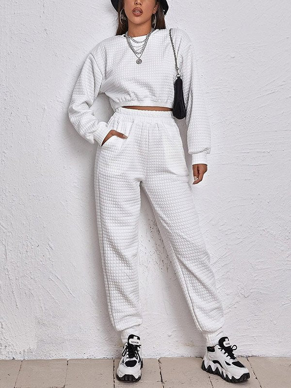 This comfortable tracksuit set is made of a soft. waffle-textured fabric in a solid color.
